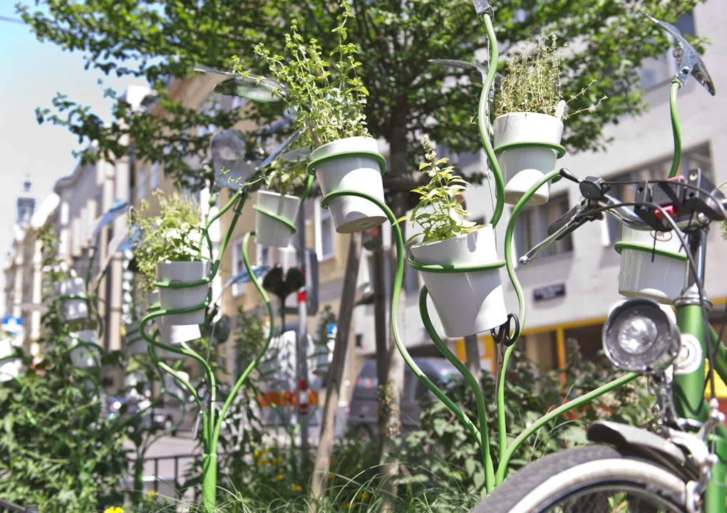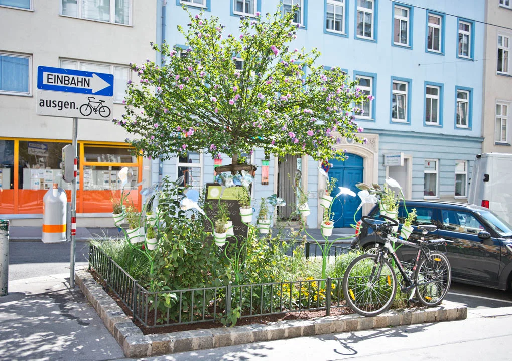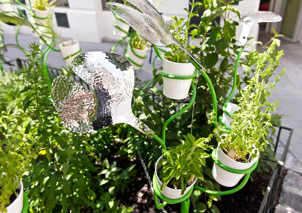 In 2015 the public green island in front of the Marien Apotheke Wien turned into a public herbes and spices garden maintained by the pharmacy. With regards to hygenical issues on the one hand and the wish to pick the herbs on a comfortable height for local residents at any age - we combined the plant pots with green metal poles. The forged ginko leaves are part of the Marien Apotheke’s Corporate Idendity and sparkle, glitter and twinkle spicy greets to the neighbourhood.